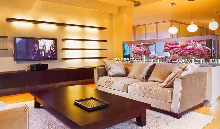 Аквариум, вмонтированный в проёме стены, часто используют для зонирования большой комнаты. Например, в квартире-студии за водным миром можно наблюдать и со