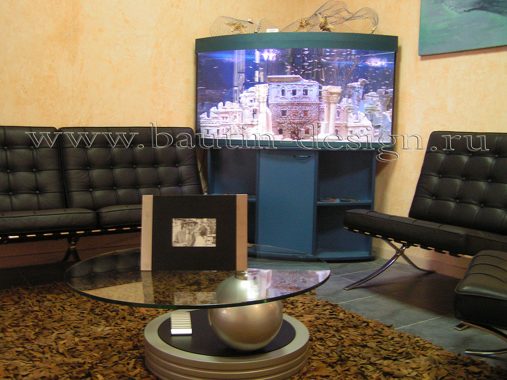 Изделия, встроенные в мебель, используют в различных стилистических направлениях, не ограниченных строгими классическими рамками. Чаще всего встречаются в форме столиков. Шикарно смотрится аква-зона в арке над кроватью.